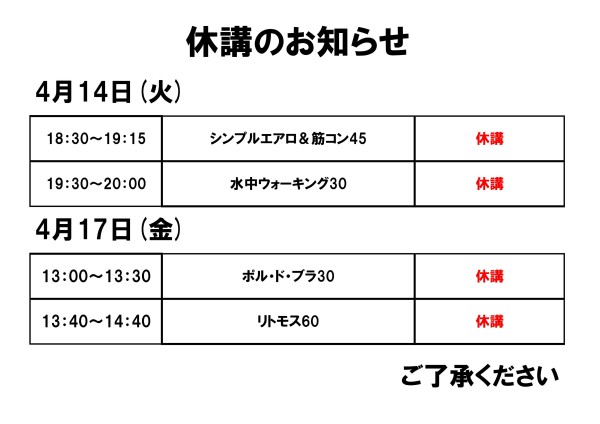 HOME»新着情報»休講のお知らせ(4月14日、4月17日)